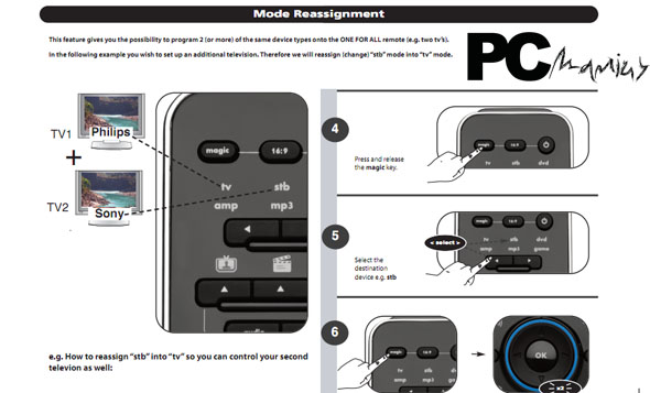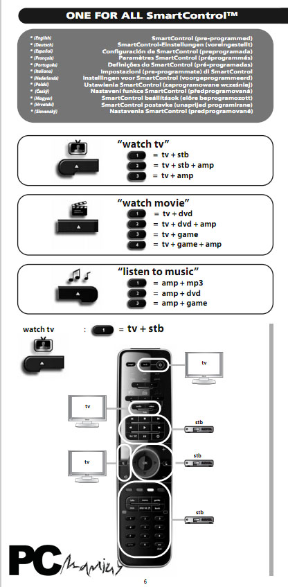 Este comando propõem-se comandar até 6 aparelhos, sendo eles televisões, Set Up Boxes, DVD’s/Blu-rays, amplificadores, leitores de mp3 e consolas (Ps3, PS2 e Xbox 360). Para tal, o comando possui uma lista completa de códigos de comandos de infra-vermelhos usada por todos os fabricantes mundiais, . Assim, caso se saiba o código correspondente ao produto que pretendemos comandar, basta fazer a programação para ele inserindo-o e associando à tecla correspondente (por exemplo, a TV).