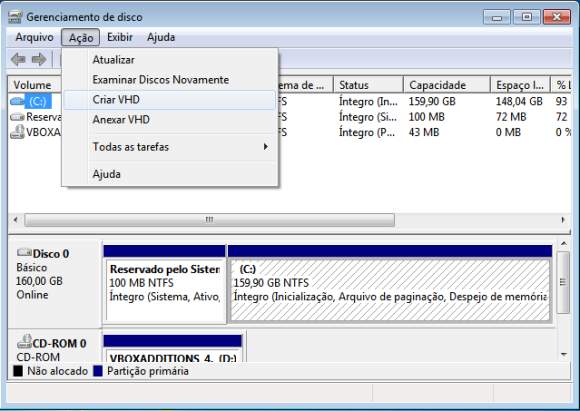 Após o arranque do gestor de discos (há que aguardar que o mesmo inicialize totalmente, podemos aceder à opção Acção e de seguida a Criar VHD, dando-se um nome e localização ao ficheiro a criar, bem como se indicando a dimensão do mesmo.
